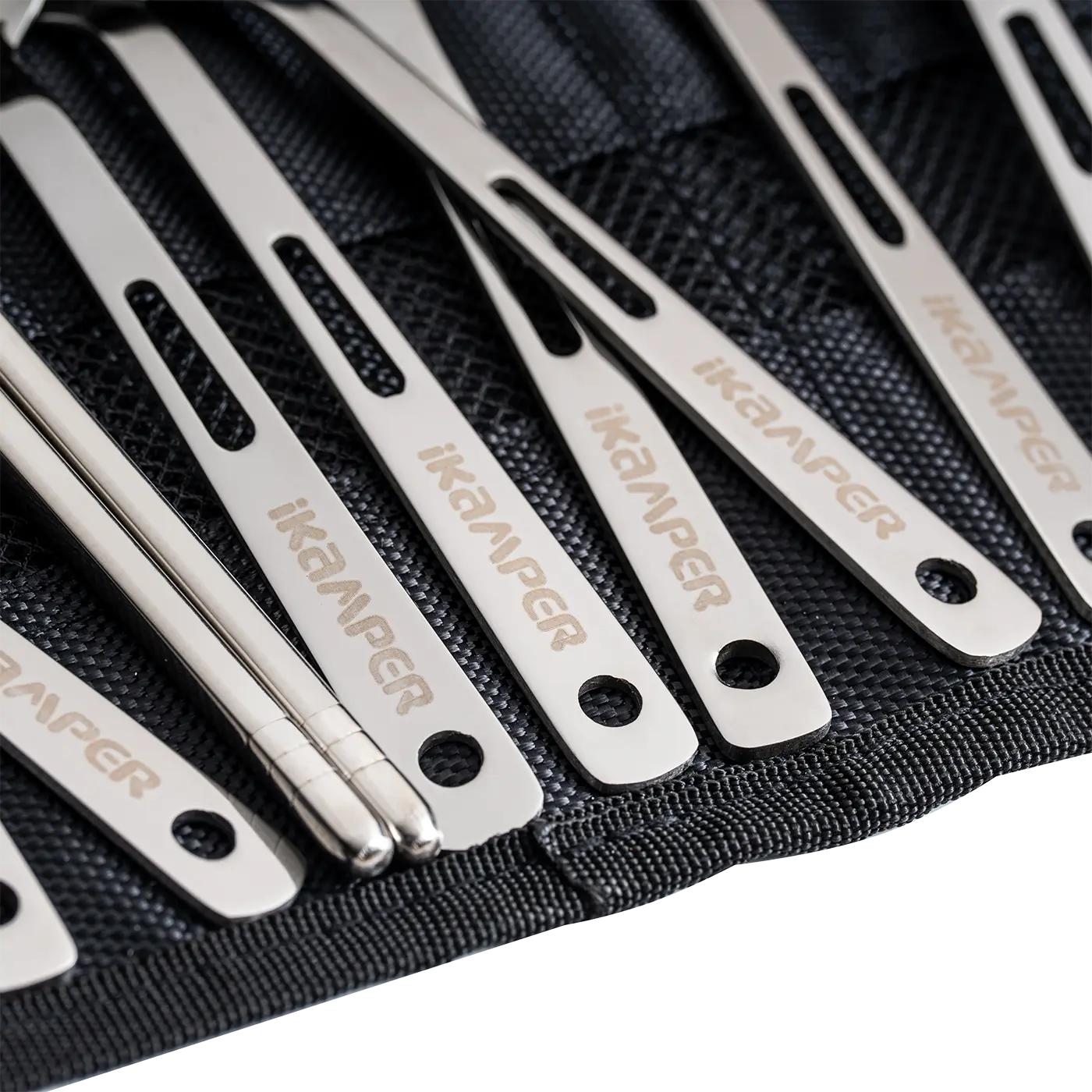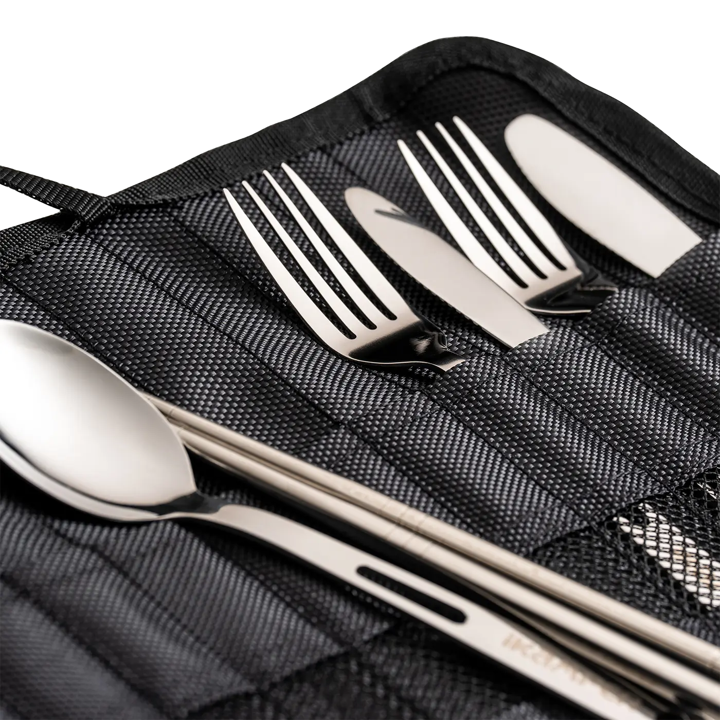 Svært praktisk bestikk i rustfritt stål, bestående av 4 kniver, 4 gafler, 4 skjeer og 2 spisepinner for servering. I en praktisk sammenrullbar lomme.
